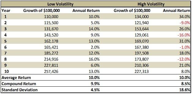 [A quick example to understand the difference between compound return and average return…You invest $100 Year 1 and lose 50%, thus leaving you with $50. In the second year, if you earn a 50% return on your money, because you only had $50 to invest, you only made $25, so the investment is now only worth $75. The average return for the two years was zero (-50% in Year 1 and +50% in Year 2), but because of the volatility, the compound (actual) return was -25%.]