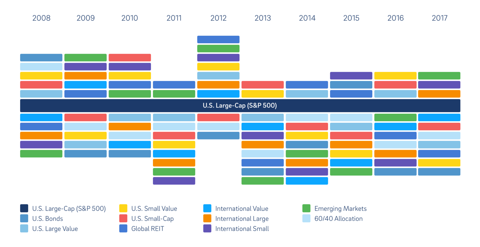 Imagine this same chart could show the performance of each country in Women’s Ice Skating from year to year. You might use it to predict which country will win next year—but then be very wrong when their routine doesn’t go as planned. Fortunately, you don’t have anything to lose, because you’re not betting on that specific country (or, in the case of your portfolio, on a specific stock).